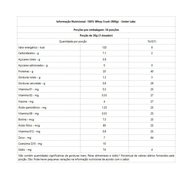 100% Whey Crush (900g) A nossa Whey Protein 100% Whey Crush é um convite para uma nova experiência sensorial, onde pela primeira vez combinamos um sabor gourmet deliciosamente surpreendente com benefícios inigualáveis. Além disso, conquistamos 3 selos essenciais que demonstram o nosso poder de inovação: O primeiro selo é o Vitamin Blends A nossa Whey Protein 100% Whey Crush tem um Blend Único de vitaminas que conta com: Vitamina B1, Vitamina B2, Niacina, Acido Pantotênico, Vitamina B6, Biotina, Acido Folico, Vitamina B12 e Zinco. Esse Blend auxilia na: * Recuperação muscular pós treino;* Aumento da imunidade;* Manutenção do foco e energia;* Saúde cardiovascular;* Redução do cansaço e fadiga. O segundo selo é o Coenzima Q10 A nossa Whey Protein 100% Whey Crush tem Coenzima Q10 que funciona como: * Antioxidante e energizante;* Anti envelhecimento;* Auxilia no controle do colesterol. O terceiro selo é o Glúten Free Livre de glúten a nossa Whey Protein 100% Whey Crush contribui para: * Auxílio na saúde digestiva e redução de sintomas gastrointestinais;* Auxílio na saúde intestinal, reduzindo inflamação e desconforto abdominal;* Auxílio na melhora da saúde em geral.
