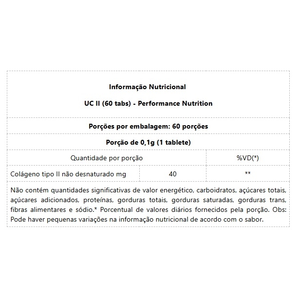 UC II (60 tabs) UC-II oferece 40 mg de Colágeno Tipo II não desnaturado por tablete, garantindo alta qualidade e eficácia. Ideal para quem busca cuidar das articulações e preservar a qualidade de vida. Benefícios presente no UC-II: – Auxilia na manutenção da função articular, contribuindo para articulações mais saudáveis e flexíveis.- Estimula a produção endógena de colágeno, promovendo suporte estrutural natural para o organismo.- Ideal para quem busca cuidar das articulações e preservar a qualidade de vida.